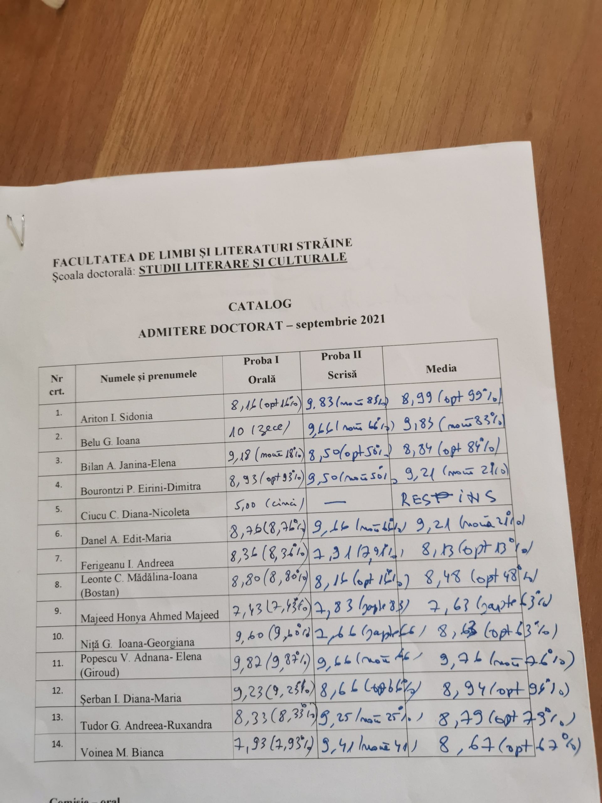 Pentru sesiunea septembrie 2021, la Școala Doctorală de Studii Literare și Culturale a fost propus următorul calendar: