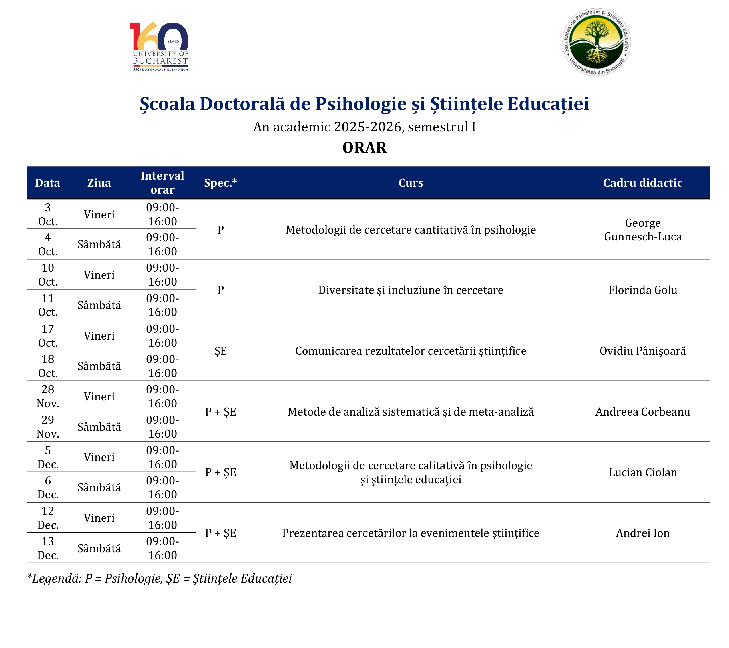 Orar ȘCOALA DOCTORALĂ DE PSIHOLOGIE ȘI ȘTIINȚELE EDUCAȚIEI Orar Prezentarea ȘcoliiAdmitereInformații generaleInformații doctoranzi ˅ Doctorat în cotutelă națională/internațională Planuri de învățământ Orar Cursuri Redactarea tezelor de doctorat Susținerea tezei de doctorat ȘtiriFormulareStudia DoctoraliaContact Meniu Școală Orar Semestrul I (2025-2026)Orar Semestrul I (2025-2026) NOUTĂȚI PhD CONFERENCE 2025 – Revealing Doctoral Insights2025-03-17 09:12:32 Selecție burse studenți-doctoranzi 20242023-11-19 21:05:21 Eveniment deschidere an universitar pentru studii doctorale2023-10-10 21:25:21 Prezentare burse Fundația „Alexander von Humboldt” - 12 Octombrie 20232023-10-07 18:15:11 Zoltán Néda la Universitatea din București2023-06-29 04:46:09 Orar Semestrul I (2025-2026)